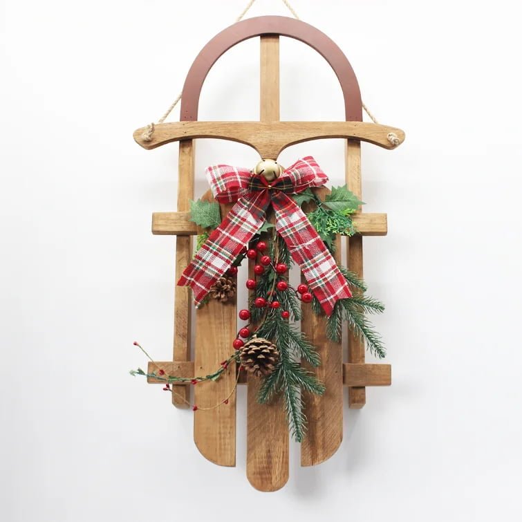 Wooden Christmas Sleigh Wall Decoration – Natural Fir Wood Holiday Hanging Ornament